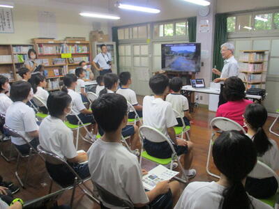 〇県民一斉防災訓練「みやざきシェイクアウト」にあわせて、小・中・地区合同避難訓練を実施しました。緊急地震速報後、小・中生徒、職員、地区の方々が熊野江小学校運動場に移動し、その後、小学校の屋上へ避難しました。とても素早い行動でした。屋上では延岡市危機管理室の方より、危難場所の確認や必要な物の準備、地震解除ボックス等の話があり、参加者全員が真剣に話を聞いていました。