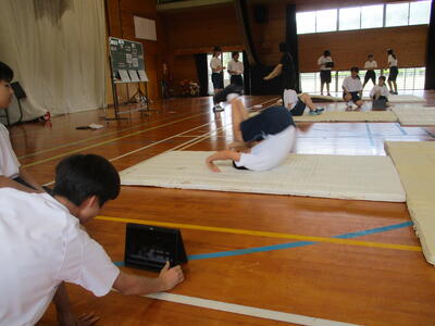 〇本校では、「学力向上」の一環として、研究授業を行っています。保健体育科では、「器械体操(マット運動)」の単元で、「開脚前転・開脚後転を滑らかに回るための、効率的・合理的な回り方を伝えることができる」をねらいに授業を行いました。生徒は自分の考えを班のメンバーに伝え、タブレットで動きを確認しながら学習に取り組みました。また、社会科では、「民主政治と政治参加」の単元で「政党や立候補者の選挙公約」を見て、様々な視点から根拠もって支持できる箇所を考えました。主権者教育の一環として、選挙の重要性も考える授業でした。