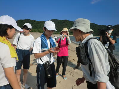 〇重要生息地に指定された「熊野江河口海浜域」について学ぶ「希少生物観測フィールドワーク」を実施しました。宮崎大学名誉教授三浦知之先生を講師に招き、生物や自然との関わりなどの講話を行ってもらいました。その後、熊野江川河口に移動して観測会を行いました。生徒は、身近な地域に貴重な生物が生息することを実感し、より南浦の自然の素晴らしさを感じたようでした。お礼に三浦先生を始め、来校された関係者の方々に、本校生徒作成のストラップをお渡しました。