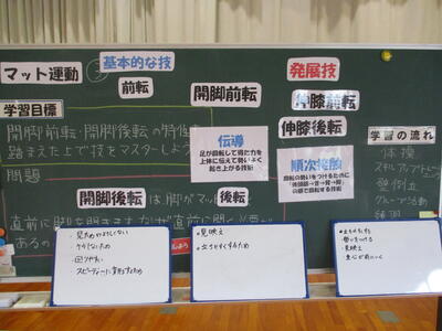 〇本校では、「学力向上」の一環として、研究授業を行っています。保健体育科では、「器械体操(マット運動)」の単元で、「開脚前転・開脚後転を滑らかに回るための、効率的・合理的な回り方を伝えることができる」をねらいに授業を行いました。生徒は自分の考えを班のメンバーに伝え、タブレットで動きを確認しながら学習に取り組みました。また、社会科では、「民主政治と政治参加」の単元で「政党や立候補者の選挙公約」を見て、様々な視点から根拠もって支持できる箇所を考えました。主権者教育の一環として、選挙の重要性も考える授業でした。