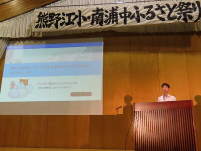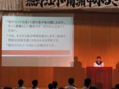 〇熊野江小・南浦中合同ふるさと祭りを行いました。和太鼓から始まり、英語暗唱弁論・小学校音楽発表・中学校リサーチ発表・中学校合唱合奏・中学校ビブリオバトル・小学校創立150周年記念発表と工夫を凝らした内容でした。また、展示も内容も素晴らしく、特に校長先生のジオラマ(若戸大橋)は参観者の目を引くものでした。閉会後は、参観の記念として、小学校作成の「しおり」・中学校作「絵はがき」をプレゼントしました。