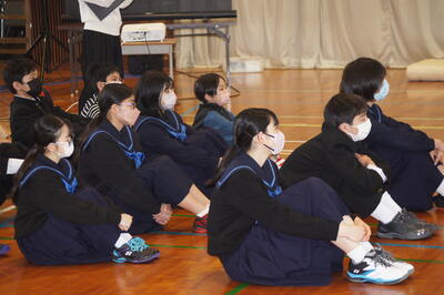 〇延岡警察署と延岡市交通安全協会の方を講師に招き、熊野江小・南浦中合同で、交通安全教室を行いました。講師の方から交通安全についての注意事項やヘルメット着用の重要性などの講話があり、全員しっかりと確認しながら聞いていました。その後実際に自転車での注意事項を具体的に学びました。特に内輪差について、気をつけることが印象に残ったようです。