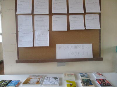 〇読書推進の一環として、生徒会が中心となり、校内図書館の本の紹介を行いました。今回は、生徒・職員に、「本の名前」・「内容」・「その本の好きな理由」と一緒に展示しました。生徒や職員も手に取り、文字の文化に触れていました。
