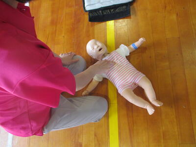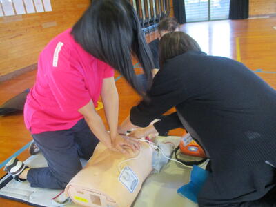 〇延岡市消防署警防課警防係の方を講師に招き、浦城小学校・熊野江小学校・南浦中学校3校合同で、「救急救命法」の職員研修を行いました。心肺蘇やAEDの使用方法を細かく確認しながらの研修でした。各先生方は、「救命のリレー」(それぞれの場面で担当者が役割を引き継ぐ)「救命の連鎖」(命を救い、社会復帰に導くために必要な一連の手順)を熱心に学び、心肺蘇生では、様々な場面での状況確認及び留意事項等について繰り返し確認しました。