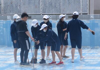 〇昨日から小雨、当日は実施できるか心配でしたが、生徒たちの実施への願いが届いたのか天気も良くなりました。生徒・職員は熱中症に気をつけながら(休息・水分補給等)楽しく行いました。小学生も小プールを一所懸命に清掃をしていました。要領よく清掃を行ったおかげで、昨年より時間も短く終えることができました。今後の保健体育(水泳)授業が楽しみです。