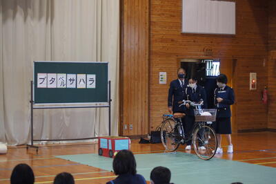 〇延岡警察署と延岡市交通安全協会の方を講師に招き、熊野江小・南浦中合同で、交通安全教室を行いました。講師の方から交通安全についての注意事項やヘルメット着用の重要性などの講話があり、全員しっかりと確認しながら聞いていました。その後実際に自転車での注意事項を具体的に学びました。特に内輪差について、気をつけることが印象に残ったようです。