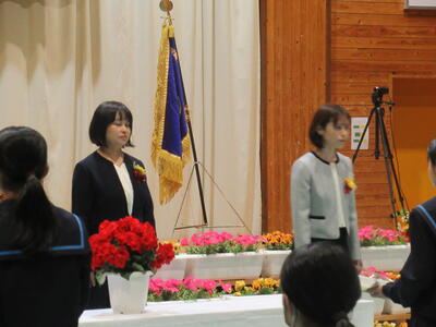 〇入学式の準備を在校生全員で心を込めて行いました。会場設営や大清掃も熱心に行い、準備に追われるなか、新入生の胸花を丁寧につけている姿は、優しさあふれる一面でした。