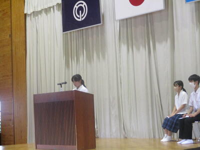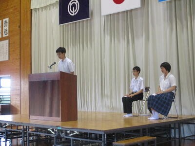 〇1学期の終業式です。各学年発表の「1学期の反省と2学期への抱負」では、自分をしっかり振り返り、次の目標とそれを達成する方策が具体的に述べられ、聞く人を惹きつける発表でした。校内で取り組んでいる「スピーチトレーニング」の成果が表れてきているように思いました。生徒の伴奏による校歌も大きな声で元気よく歌うことができました。校歌は学校を愛する現れの一つだと思いました。