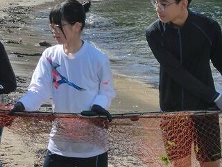 〇南浦地区青年少年育成協議会とPTAが協力して「生徒交流デイキャンプ~地曳網体験」を行いました。児童生徒は、須美江海岸の保全や危険生物の話を聞き、その後地曳網を体験しました。網にはたくさんの種類の魚が獲れ、児童生徒は講師の方と一緒に魚の名前を確認しながら仕分けをしました。獲れた魚なども食材としてバーベキューも行いました。最後にスカイ割りを行い、とても楽しく有意義な1日でした。