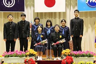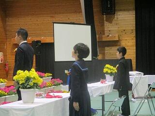 〇在校生が心を込めて設営した会場で、多くの来賓がご臨席の中、第10回卒業証書授与式を行いました。校長先生から卒業証書を授与される卒業生の表情はとても緊張しているかのように見えました。在校生代表送辞は、卒業生へ思いがあふれ、卒業生答辞では、参加者が感動する内容でした。卒業生退場で、在校生から花束をもらう姿は感動的でした。学級活動では3年間の思いがあふれる涙が止まらないものでした。巣立つ卒業生に感謝しました。