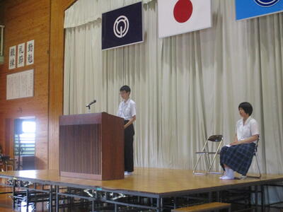 〇1学期の終業式です。各学年発表の「1学期の反省と2学期への抱負」では、自分をしっかり振り返り、次の目標とそれを達成する方策が具体的に述べられ、聞く人を惹きつける発表でした。校内で取り組んでいる「スピーチトレーニング」の成果が表れてきているように思いました。生徒の伴奏による校歌も大きな声で元気よく歌うことができました。校歌は学校を愛する現れの一つだと思いました。
