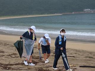 〇熊野江小・南浦中・地区合同で、熊野江海岸清掃を行いました。小雨の中での開始でしたが、徐々に天候が回復し、参加者全員で1時間程度の清掃活動でした。清掃後、生徒が「とても美しい熊野江海岸(海水浴場)に多くの方が訪れてもらいたい」と話してくれました。
