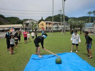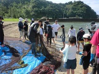 〇南浦地区青年少年育成協議会とPTAが協力して「生徒交流デイキャンプ~地曳網体験」を行いました。児童生徒は、須美江海岸の保全や危険生物の話を聞き、その後地曳網を体験しました。網にはたくさんの種類の魚が獲れ、児童生徒は講師の方と一緒に魚の名前を確認しながら仕分けをしました。獲れた魚なども食材としてバーベキューも行いました。最後にスカイ割りを行い、とても楽しく有意義な1日でした。