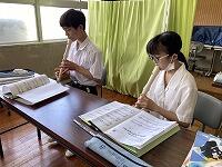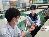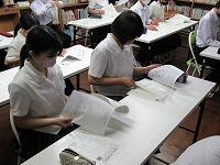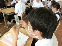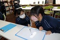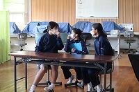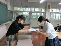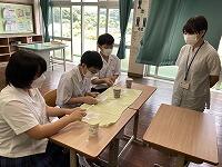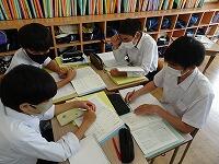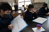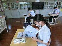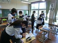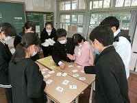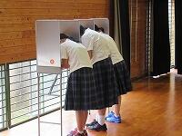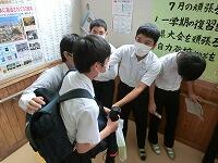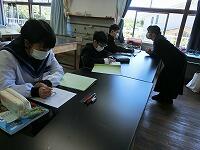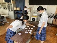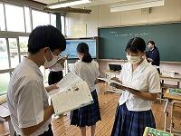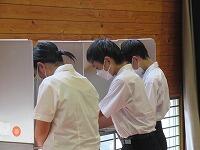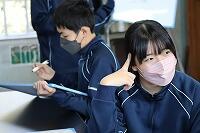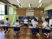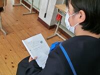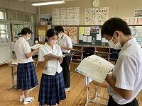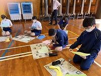 学校にまつわるクイズに新入生は頭を抱えて、でも真剣に考えました。「南浦中学校が開校した日は何日でしょう?」「若山牧水の短歌は学校にいくつ飾られてる?」・・・難しいから楽しかったです。