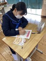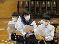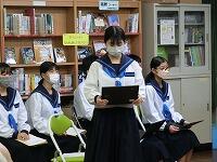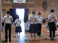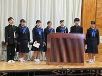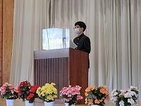 そして、送辞。在校生代表が1年から書きためた短歌で先輩との思い出を振り返りました。「もう一度やってみたいな「わははは」と 過ごした時間絵描き対決」(歓迎行事)「観覧車見える景色はきらきらとイルミネーション 友との思い出」(修学旅行)「目を閉じて練習思い走り出す 大きな声でソーランソーラン」(運動会)ー先輩方のおかげで安心して学校生活を送れたと感謝の言葉を述べました。そして最後に「私もね 大きな背中になるために 未来に向かって足を動かす」ーこれからは、尊敬する先輩方のようになるよう、頑張っていきますと南浦中の伝統を受け継ぐことを約束しました。