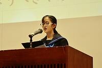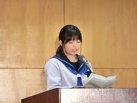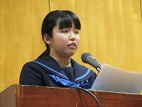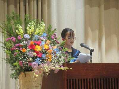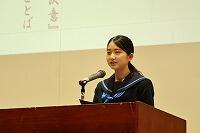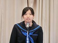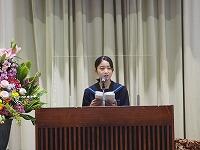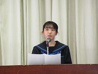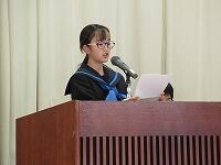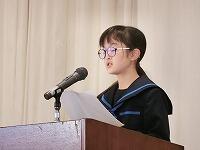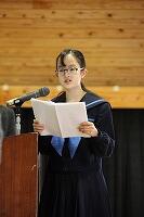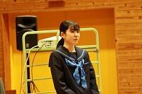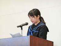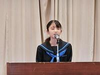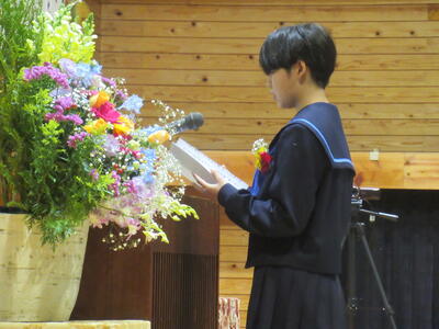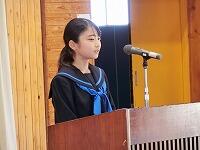 答辞「友へーとても人見知りだった4人。でも、自分とは違う魅力をもった友だと知って、密な関係になりました。楽しい学校生活が続く一方で、新たな悩みがでてきました。「自分だけができなかったらどうしよう。」しかし、そんな不安も3人が拭ってくれました。弱音を吐いても親身になって話を聞いてくれ、同じラインに立てるようになるまで手をさしのべてくれました。父母へー迷惑をかけたり、心配をさせたりもしたけれど、私たちを励まし、信じて背中を押してくれました。心を込めてありがとうと言わせてください。」心の中の言葉を声に出しました。