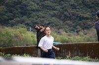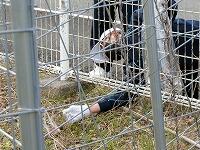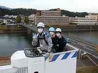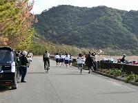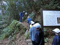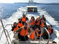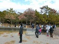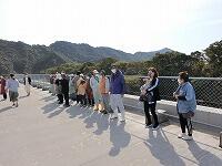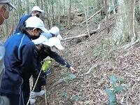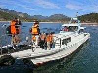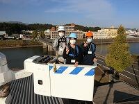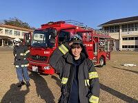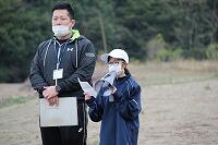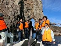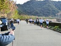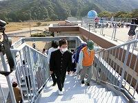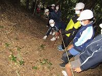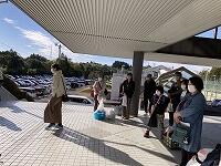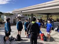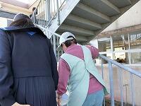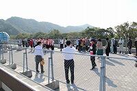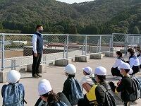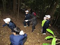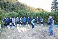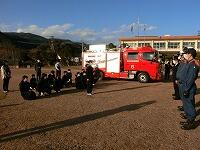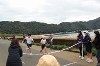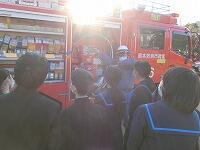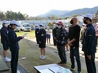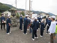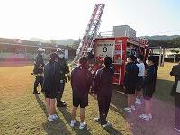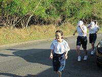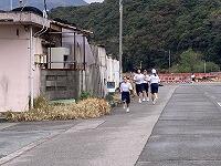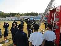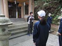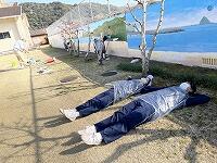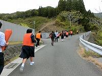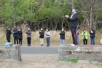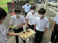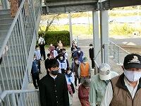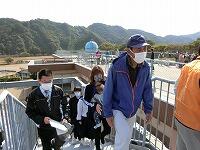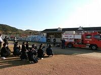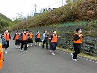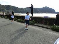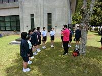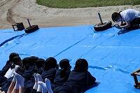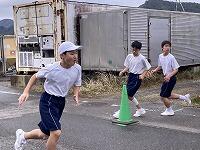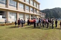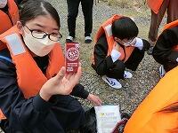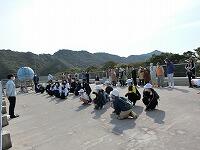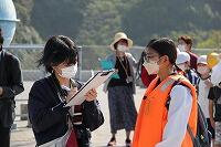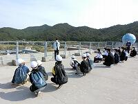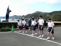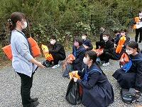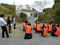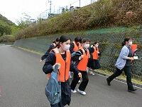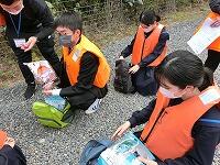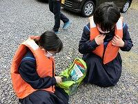 そして、浦中学校にいる時に津波警報がでた時の避難場所も確認し、今日は第1目標の「いのちの杜」(斎場)に避難です。ライフジャケットと「防災リュック」を持ち、先生方の車に乗車します。「いのちの杜」に到着したら小高い空き地に走ります。