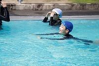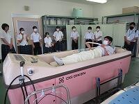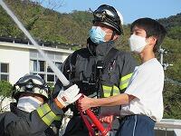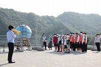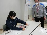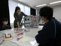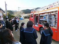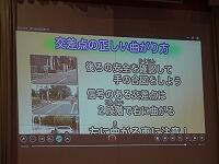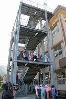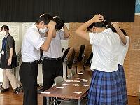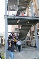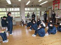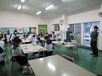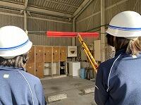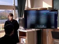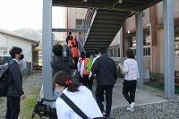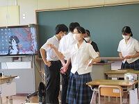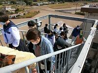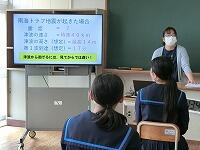 まず、防災についての事前指導が教室で行われました。2011年3月東日本大震災があった時は1歳~3歳だった生徒達は、東日本大震災で津波が起こったときの映像を見ながら、真剣に避難の方法を学びました。