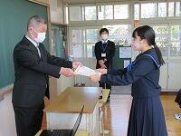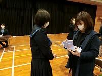 校長先生の式辞では、「予測が難しいこれからの社会を生きていくには、自分で判断し、周りの人と支え合うことが今まで以上に大切になります。仲間とともに自分を磨き輝かせてください。そして、この南浦中で学んだ、保護者、地域の方々、そして先生方からの愛情、学年を超えた生徒同士の友情などを忘れずに。」との言葉をいただきました。PTA会長の祝辞では、「コロナ禍で縮小された行事やできなかったこともありました。しかし、それをプラスにとらえ、何だったらできるか、どんな方法があるかを考えることにより、視野が広がり成長につながったと考えられないでしょうか。見方考え方の転換から前進することのできる人であって欲しい。」との言葉をいただきました。