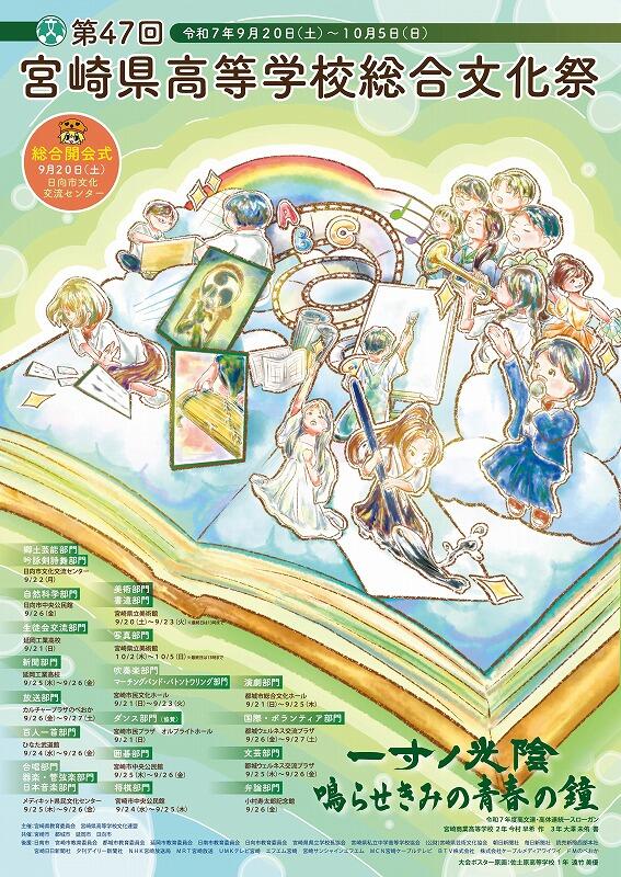 第四十七回宮崎県高等学校総合文化祭は、県内各所で、全二十一部門に、六十四校から約三九〇〇名の高校生が参加しました。ステージ発表や競技会、作品展や生徒交流が行われ、高校生一人ひとりが輝く、実りの多い大会となりました。