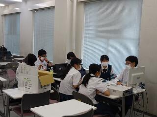 各班協力して完成を目指します。ノートパソコンやスマホをつかって文章を入力しているようです。