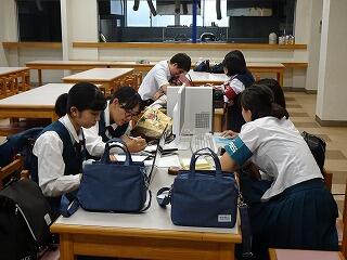 各班協力して完成を目指します。ノートパソコンやタブレット、スマホなどをつかって文章を入力しているようです。