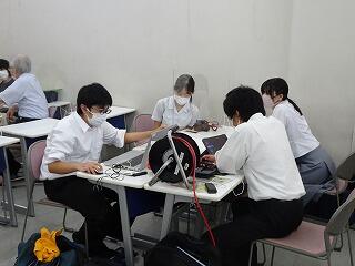 各班協力して完成を目指します。ノートパソコンやスマホをつかって文章を入力しているようです。