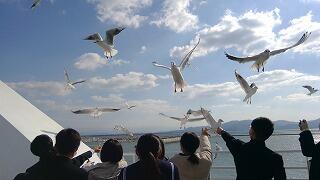 フェリーに乗る前に、昼食をとりました。フェリーに乗り込むと、カモメたちが出迎えてくれました。(かっぱえびせん目掛けて近寄ってくるカモメの群れ)