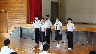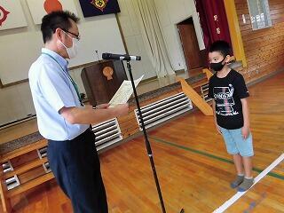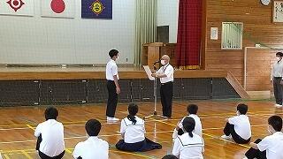 表彰もありました。旅する読書で100冊を達成した「小田響大朗君」、ソフトテニスの県大会で活躍した「野﨑海斗君」の二人でした。
