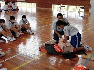 7月2日(木)5~6校時に、8年生が心肺蘇生法講習会に参加しました。日南消防本部より3名の隊員の方に来ていただき、心肺蘇生法について学びました。