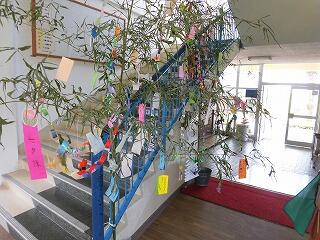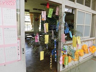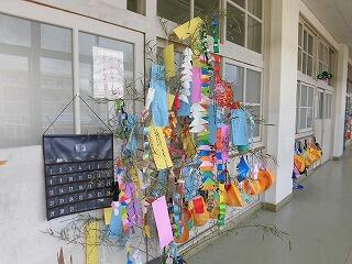 東郷小中学校の玄関と旧小学校玄関に七夕飾りが設置してあります。