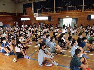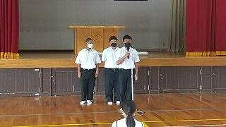 係の先生方からの話もありました。 生徒指導の先生は、危ない場所(遊泳禁止の浜等)に行って遊ばない。命を大切にすることについて話しました。 学習指導の先生は、9月の学習態度徹底週間の取り組みの結果について振り返りました。