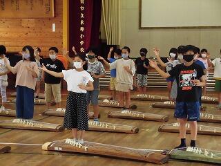 代表の児童が打楽器を使って一緒に演奏しました。代表の先生方のリズムダンスもありました。