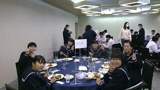 ホテルで美味しく夕食をいただきました。メニューはトルコライスとデザートです。円卓がパーテーションで区切られ、感染対策をしっかりとって食事をとることができました。係による後片付けもしっかり行われ、マナーを守って第一目の夕食を終えることができました。