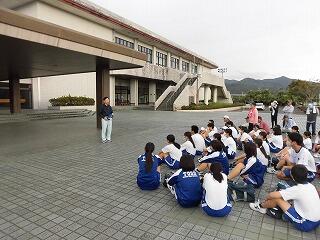 今回は、毎年の清掃のみに終わるのではなく、アカウミガメの生態などを児童により深く興味を興味をもって、地域や自然を愛する心を育てたい願いから講師をお招きしました。
