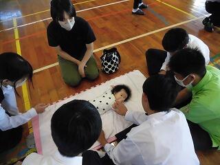 4月16日(水)、小中学校健康指導部主催による心肺蘇生法が実施されました。日南消防本部署員の方々を講師にお招きし、全職員が受講しました。