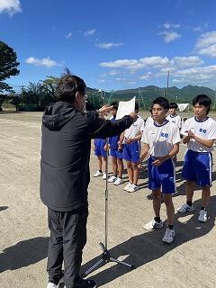 校長先生のお話では、スポーツには2種類の関わり方がある。スポーツを楽しむ関わり方、真剣勝負としての関わり方、みなさんは、真剣勝負として秋季大会に臨み、自分たちの練習の成果を十分に発揮し、夏の大会に向けての力の確認をしてきて欲しいとお話されました。