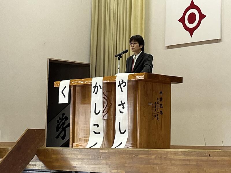 その後の始業式で、校長先生から、めざす児童生徒像である「優しく」「賢く」「たくましく」についてお話がありました。「間違いや失敗も大切な勉強。学習に、運動に、部活に、一生懸命に取り組んで、失敗や間違いを乗り越えられる、賢い子どもになってほしい!」というお話を、児童生徒は真剣に聞いていました。