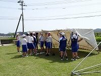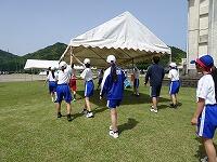 実行委員の声かけのもと、グループで取り組み、予定時間より大幅に早く、たくさんのテントを組み立てることができました。さすが中学生です!