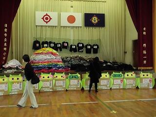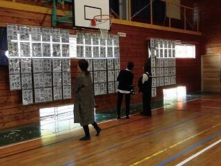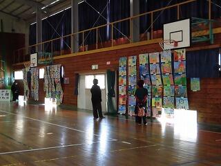 小学校の体育館には、色鮮やかな感想画やすばらしい作品が展示してありました。また、「服のチカラプロジェクト」で集まった服も展示してあり、心温まる活動が行われていたことが伝わりました。