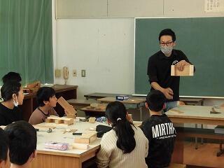 講師の「谷材木店」さんに「えんぴつ立て」の作り方を教えていただきました。「えんぴつ立て」が出来上がった後は、飫肥杉の特徴等について説明していただきました。