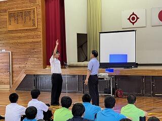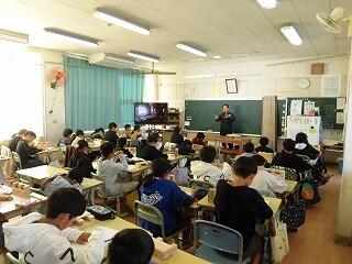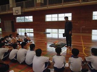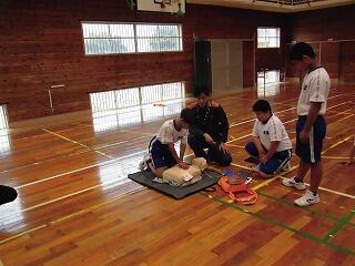 3校時に日南消防署員の方々にお越しいただき、心肺蘇生法の学習をしました。これから夏に向け、水難事故等にいつ遭遇するかわからないため、命を大切にする態度を育てることを目的に学習しました。