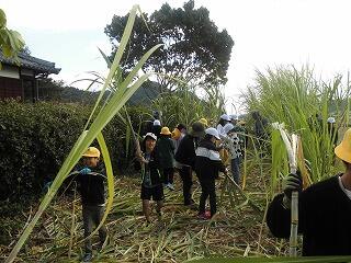 11月30日(木)に、学習畑で育てたさとうきびの収穫を行いました。そして12月1日(金)に、風田地区にある工場に行って、収穫したさとうきびが地域に伝わる伝統的な製法によって黒砂糖になる過程を見学しました。