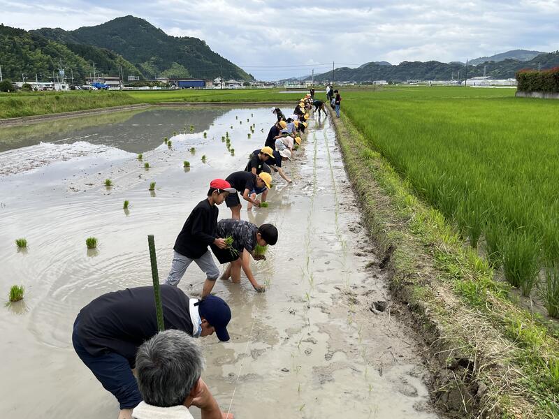 子どもたちは、代搔きをされた泥の感触に、歓声をあげていました。おそるおそる植えていた姿が、時間の経過とともに手慣れた姿へと変わりました。
