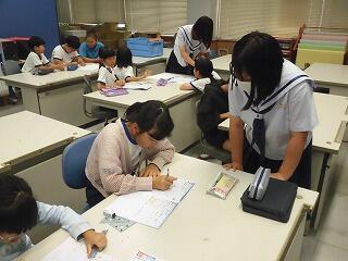 スタディーサポートとは、小学生の1年生から6年生までを対象に、昼休みの時間を使って、中学生が勉強を教える時間です。小学生の質問に中学生が必死に答える姿がとても微笑ましく感じられました。