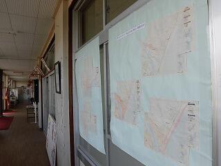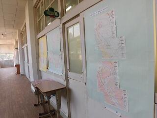 「東郷地区の土砂災害や洪水の浸水が想定される地域」を表示した「ハザードマップ」を校内に掲示し、児童生徒に確認してもらっています。