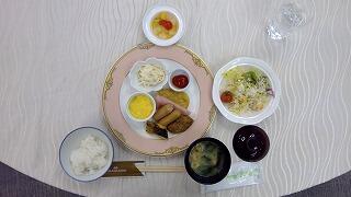 ホテルで美味しく夕食をいただきました。メニューはトルコライスとデザートです。円卓がパーテーションで区切られ、感染対策をしっかりとって食事をとることができました。係による後片付けもしっかり行われ、マナーを守って第一目の夕食を終えることができました。