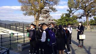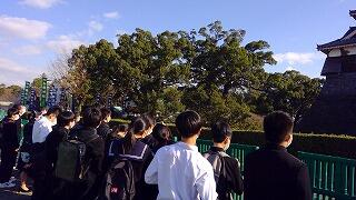 午前中、自分たちで考えた熊本クイズで盛り上がり、バスガイドさんの熊本に関する説明を、一生懸命聞きながら勉強をしました。熊本城を見学する中で、熊本の発展に尽くした清正公の優れた土木技術に先見性を感じるとともに、震災の爪痕を目前にして、一日も早い復興を願う気持ちが強くなりました。