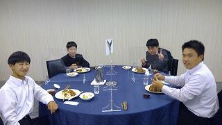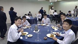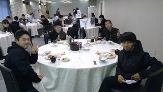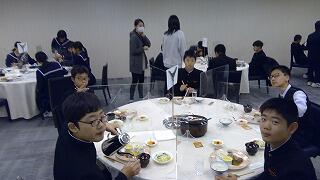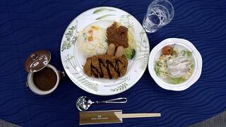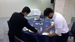 ホテルで美味しく夕食をいただきました。メニューはトルコライスとデザートです。円卓がパーテーションで区切られ、感染対策をしっかりとって食事をとることができました。係による後片付けもしっかり行われ、マナーを守って第一目の夕食を終えることができました。