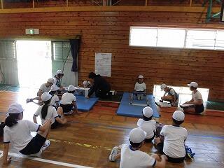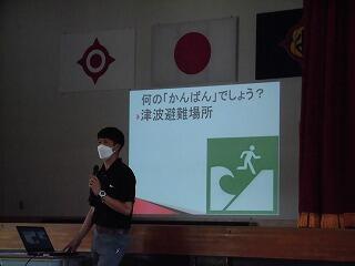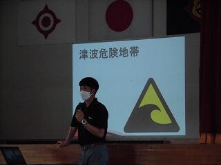 その後、体育館で「防災集会」を行い、津波発生のしくみや津波避難場所・施設等のマークについて確認しました。
